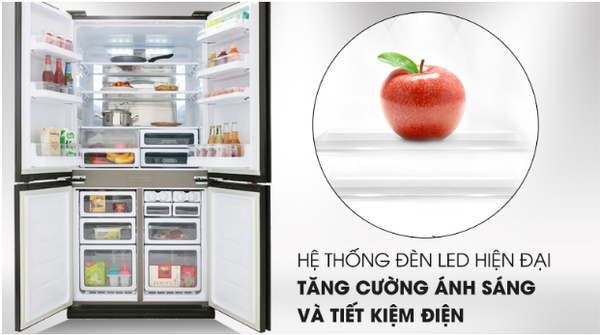 Tủ lạnh Sharp được trang bị hệ thống đèn LED tăng cường ánh sáng tạo cảm giác không gian thoáng đãng cho bạn khi sử dụng tủ lạnh.